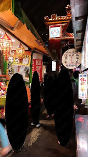 横山さんと村上さんがピースをしながら写っている屋台は、門を抜けてわりとすぐの所にあります。饒河街夜市は道の中央に屋台が並んでいて歩行者はその左右を通る形になっているのですが、西側の門から行くなら右側から入ります。
